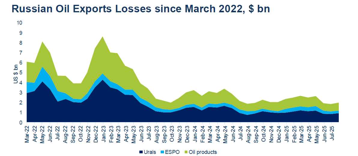 Vaicāti par to, kuras sankcijas Krievijai nodarījušas vislielākos zaudējumus, abi eksperti ir vienisprātis, ka būtiskāko ietekmi radījuši pret enerģētikas sektoru vērstie ierobežojumi. ES noteiktais embargo jēlnaftai un naftas produktiem būtiski ierobežoja Krievijas piekļuvi Eiropas tirgum. Tas 2023. gada sākumā piespieda Krieviju meklēt jaunus pircējus citos tirgos, nereti pārdodot naftu ar ievērojamām atlaidēm, kā rezultātā būtiski samazinājās ieņēmumi. KSE institūts lēš, ka laika posmā no 2022. gada marta līdz 2025. gada augustam Krievija ir zaudējusi 159 miljardus ASV dolāru potenciālo ieņēmumu (skat. 1.,2. attēlu).